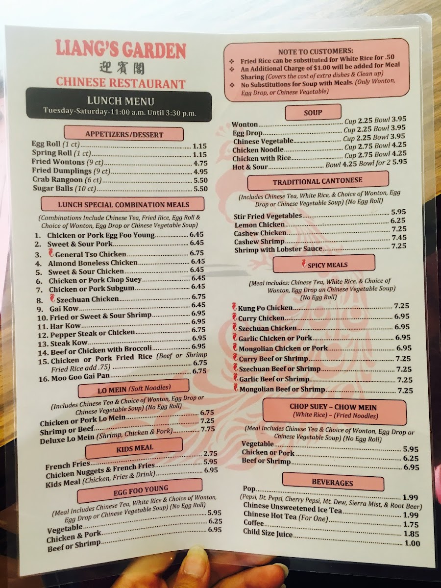 The menu at Liang's Garden offers a straightforward and approachable selection of Chinese and Asian dishes that blend classic flavors with familiar comfort. Expect a variety of well-loved options such as savory chicken dishes, hearty soups, and combination plates that provide satisfying meals whether you’re dining in or grabbing a takeout.